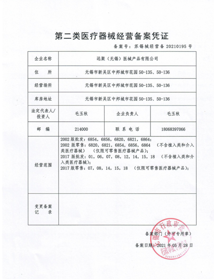 Class II medical device business Filing Certificate